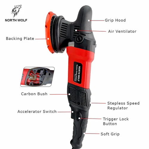 North Wolf Dual Action Polisher model DP515 is a cost-effective hot selling model. 900 watt powerful input, popular design, soft grip long handle is easy to use, 15mm orbit in 5inch backing plate.